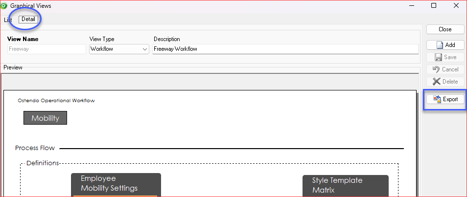Refresh: The current Workflow is loaded ‘into memory’. If you have made changes to an existing workflow and imported that 'view' back into Ostendo you can refresh select this option to reload the saved Workflow.
